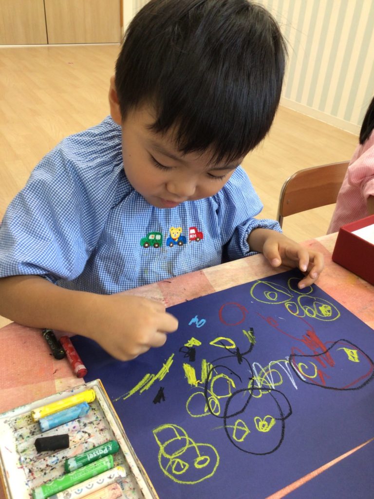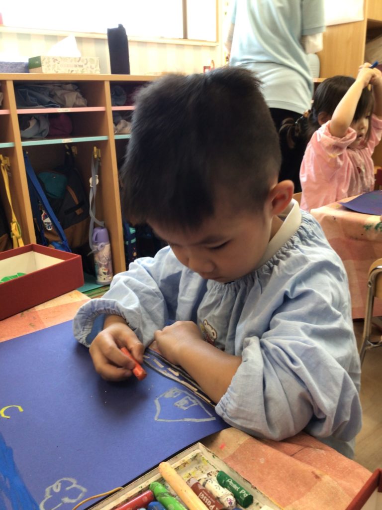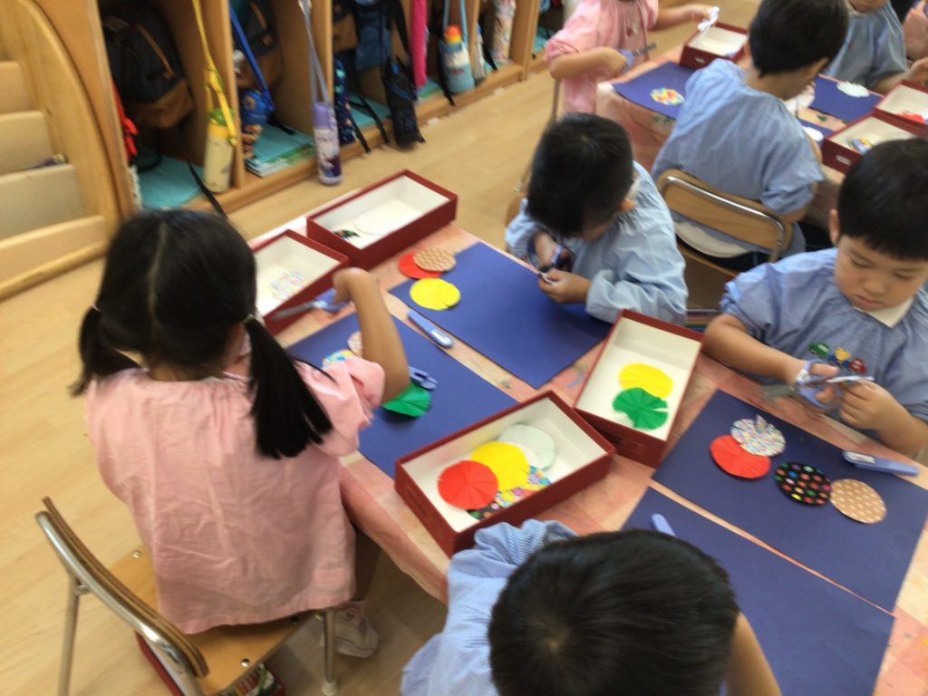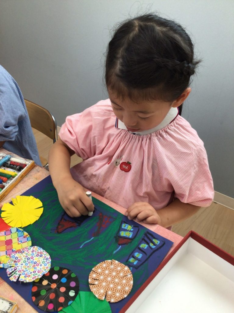 今日はPanda classのお友達が夏の思い出に花火の製作をしましたよ。まずは大きく開く花火を折り紙で作りました。みんな、はさみを使って線状に細く切り込みを入れていますね。とっても上手です。次に画用紙にクレヨンで絵を描きました。家族で花火大会に行ったり、お祭りで花火を見たりとたくさんの思い出をのびのび描くことができました。最後に花火を夜空に貼り付けて出来上がり!素敵な作品になりましたね。Great work!