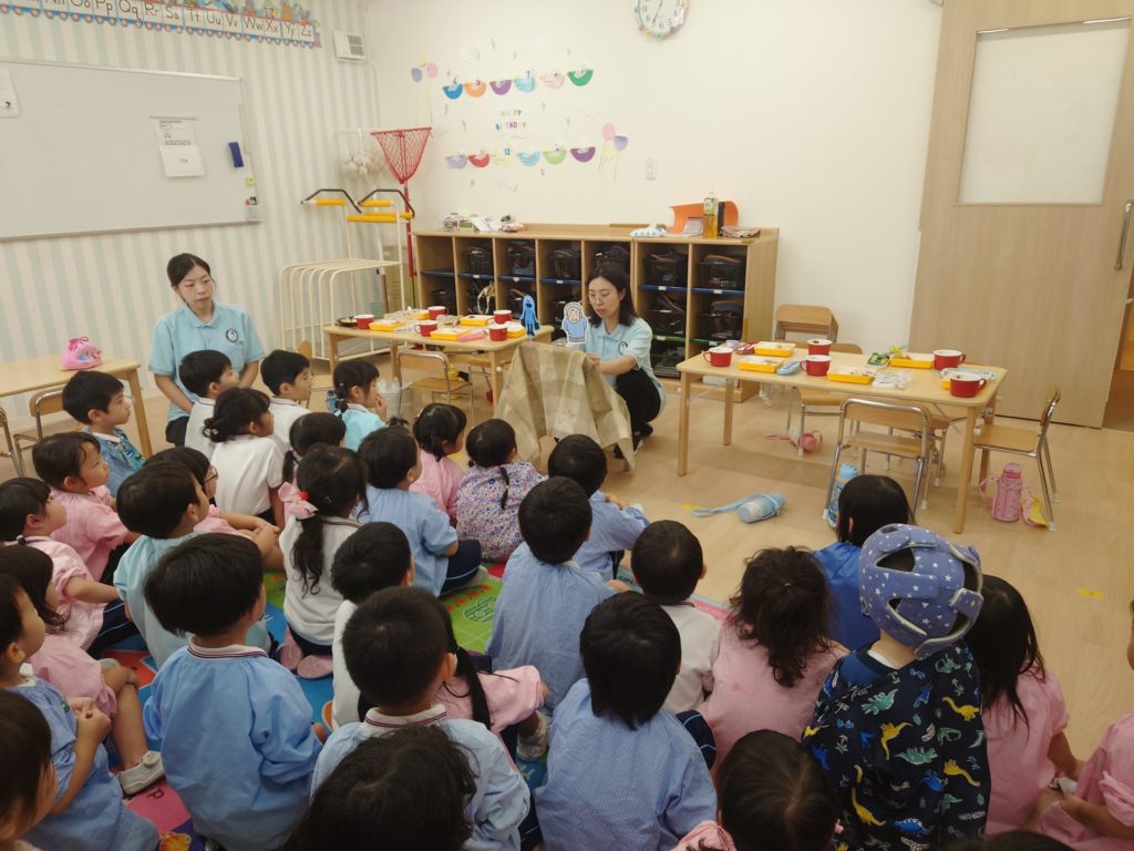 Hello, everyone!今日は園内に不審者が入ってきた想定でどのように身を守るかの訓練を行いましたよ。みんなで楽しくランチを食べている時に突然防犯ブザーが鳴りました。園長先生から職員間で決められている不審者侵入を知らせる秘密の言葉を聞いた先生は、すぐに子ども達を一か所に集め、ドアをロックし窓をふさいで中が見えないようにしました。その後みんなで集まって知らない人が連れ去ろうとしてきた時にどうすべきか、みな先生が人形劇で教えてくれました。このような場面に遭遇しないようにしたいですが、万が一の時には今日の訓練を思い出してほしいと思います。Today the children received training to deal with suspicious persons in the school.While everyone was happily eating lunch, the security alarm suddenly sounded. Upon Ms. Emi informed the secret word, the teacher immediately gathered the children in one place, locked the doors, and blocked the windows to prevent anyone from seeing inside. Afterward, everyone met together and Ms. Mina showed a puppet show to teach the children what to do if an unknown person tried to take them away. We hope such a situation never occurs, but if it ever does, we want them to remember today’s drill.