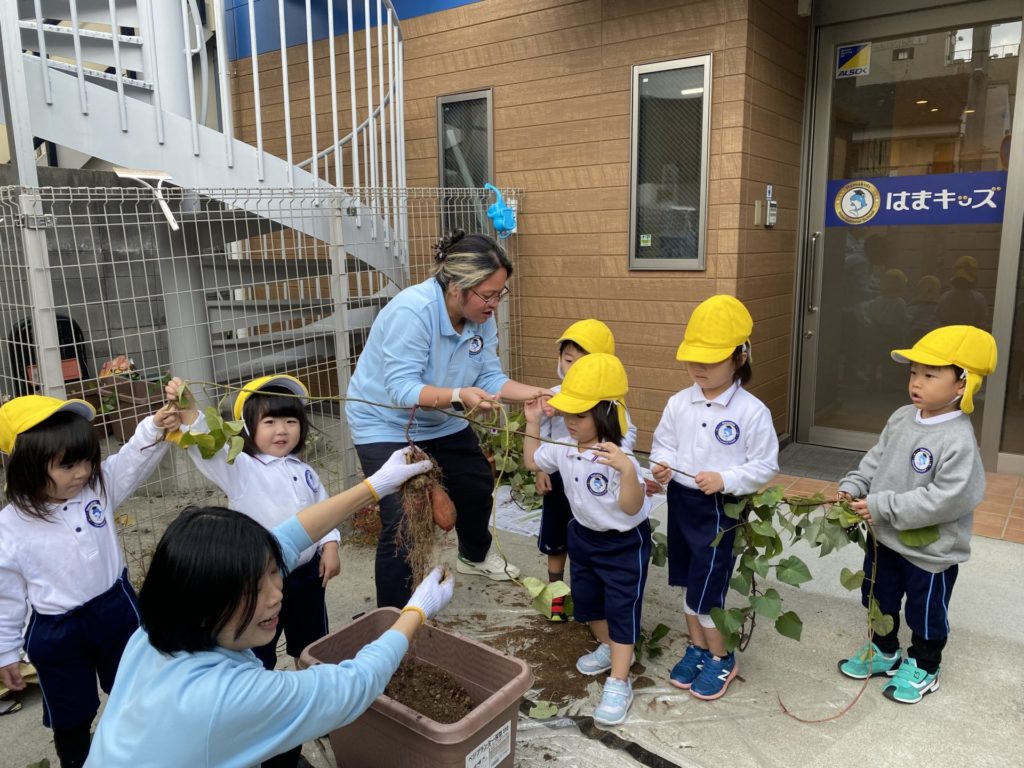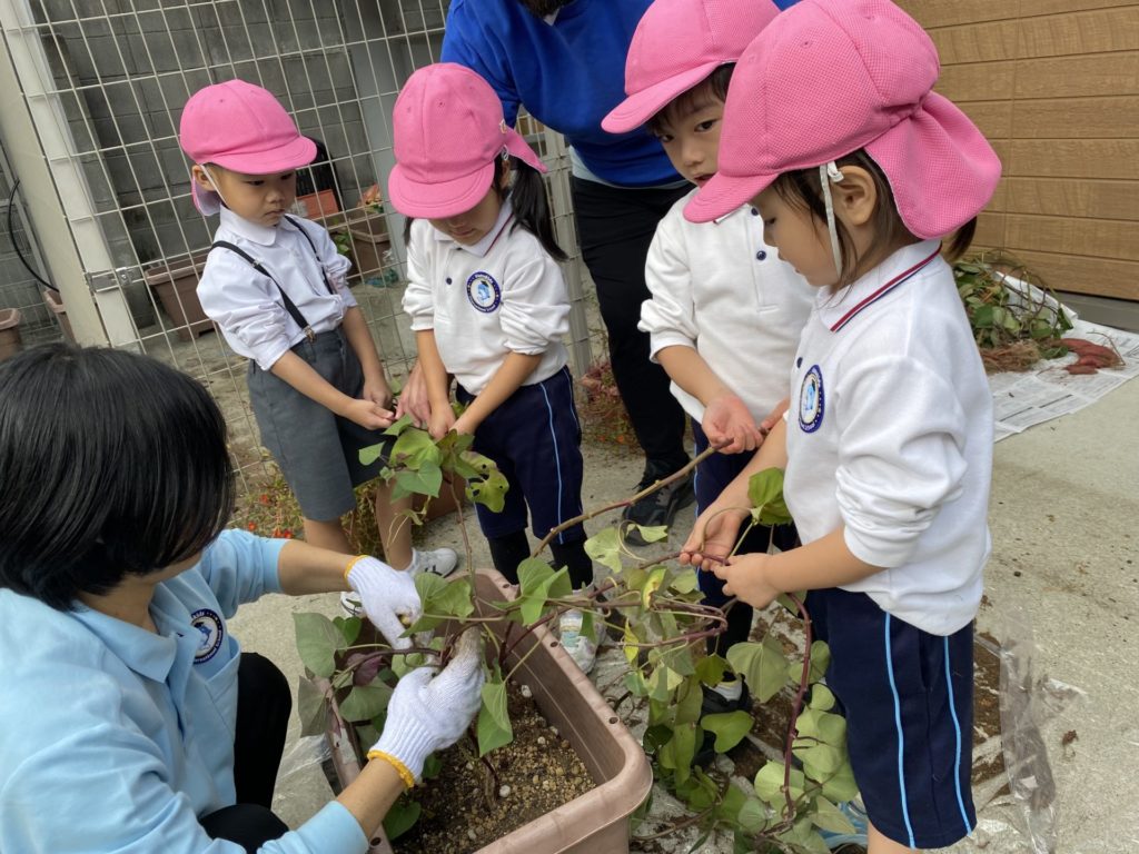 クラス別にグループに分けられた子ども達が順番にツルを持って引っこ抜きます。急いで引っ張りすぎて、お芋が土の中から顔を出す前にツルが切れてしまったグループもありましたがみんなで応援しあいながら収穫を楽しみました。小ぶりながらおいしそうなおイモはしばらく寝かせた後に給食で提供する予定です。