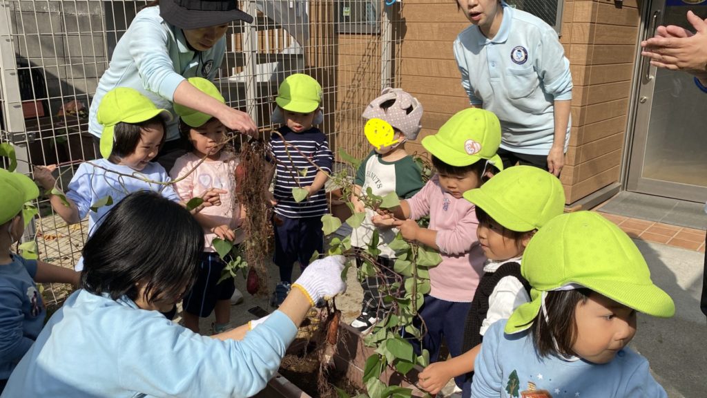 The sweet potatoes planted in May grew well, and the day of the big harvest finally arrived! After finishing their usual radio exercise, the children were told to sit on the grass. Ms. Emi showed them several planters and asked where the potatoes were growing. The children could answer correctly that they were underground.The children, divided into groups by class, took turns pulling the vines. Some groups pulled too quickly, snapping the vines before the potatoes could peek out of the soil, but everyone cheered each other on and enjoyed the harvest. The small but delicious-looking potatoes will be stored for a while before being served at lunch.