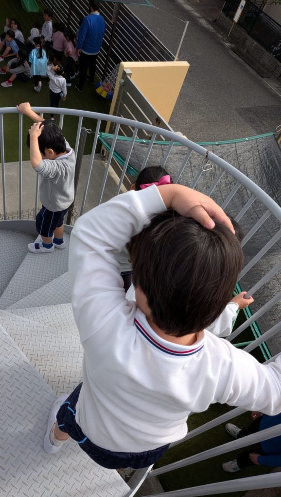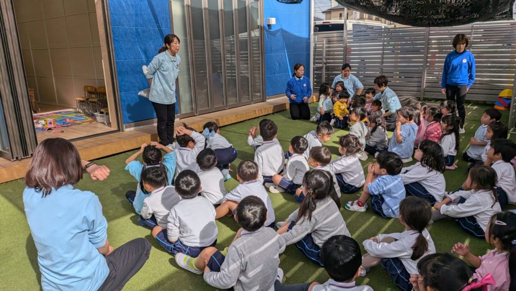 Today we held an earthquake evacuation drill. After lunch, while everyone enjoyed playing, the earthquake alarm suddenly sounded. The children immediately assumed the “dung beetle pose” to protect their heads. After evacuating to the playground, we talked about how many earthquakes have occurred in Japan this past week, and how even earthquakes far away can affect our local area. Let’s remember the evacuation rules just in case.