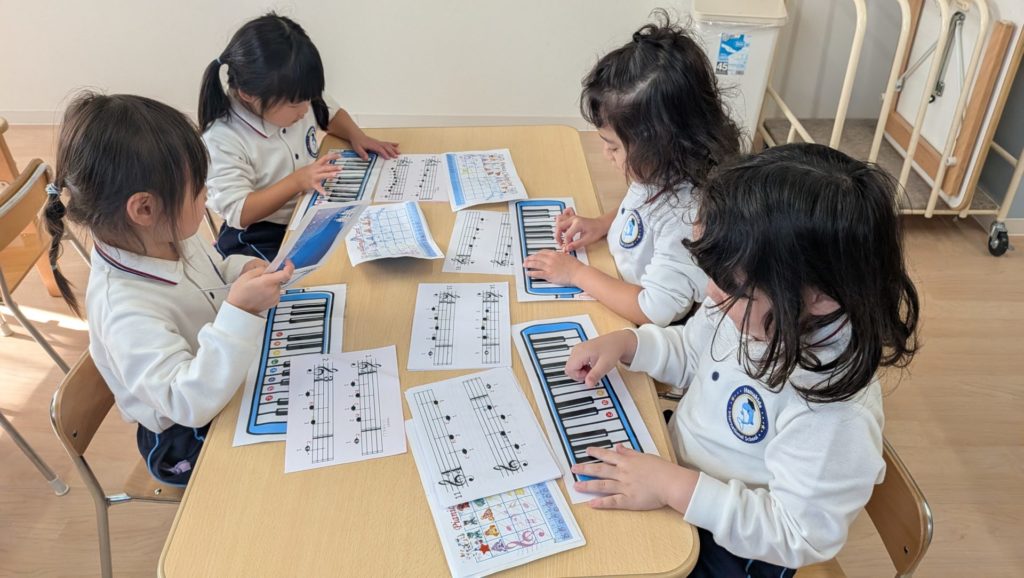After finishing lunch, the Panda class children are practising their melodicas. Having only started learning the keyboard harmonica this term after moving up to Year 2, they are currently undergoing intensive training in finger positioning. They are checking the correct finger placement on the keyboard sheet created by Ms. Kaoru. They plan to perform at the recital next term. How exciting!