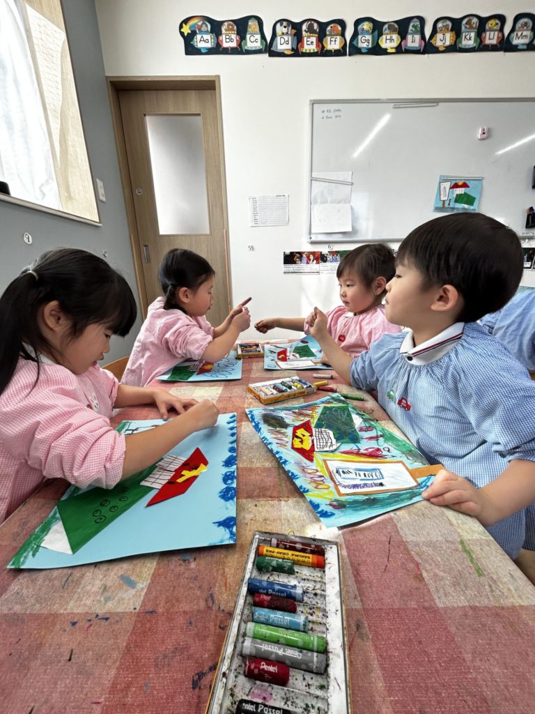 Although the New Year mood has already faded, during Japanese culture time in the Panda Class, the childre made Shishimai, lion dance and Hagoita paddles related to the New Year. Each child freely drew pictures on their hagoita paddle. The backgrounds also turned out wonderfully, full of originality. Just like the friends in the Panda Class, they were able to express themselves freely with crayons. Good job!