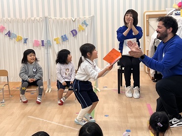 Hello, everyone! 今日は1月生まれのお友達のお誕生会をしました!今日の司会はかおる先生の予定でしたが、助っ人が来てくれましたよ。パンダクラスのマスコット、ピィちゃんです。ピィちゃんが主役のお友達にお名前と何歳になったのか質問すると、みんな嬉しそうに答えてくれました。お祝いをする側のお友達がMC初挑戦のピィちゃんに次はみんなからの歌のプレゼント、次は先生からお誕生日のお友達へのバースデーカードのプレゼント、と教えてくれたおかげで素敵なお誕生会になりましたね。