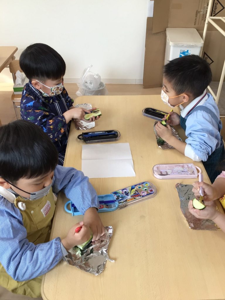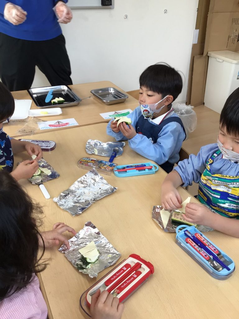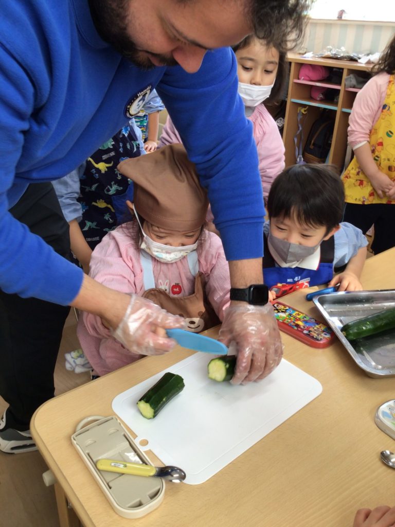 Hello, everyone! 毎月のテーマに沿ったクッキングは子ども達が大好きな活動の一つです。先生がいろんな食材を使って紹介してくれるメニューは子ども達になじみのあるものから新しいものまで様々です。1月のPanda classのクッキングではズッキーニとツナを使ったボートを作りましたよ。子ども達は自分でズッキーニの中をくり抜き、そこにマヨネーズと合わせたツナとチーズを入れてオーブンで焼きました。くり抜きには少し苦労しましたが、その分美味しさは倍増のズッキーニボートでした。